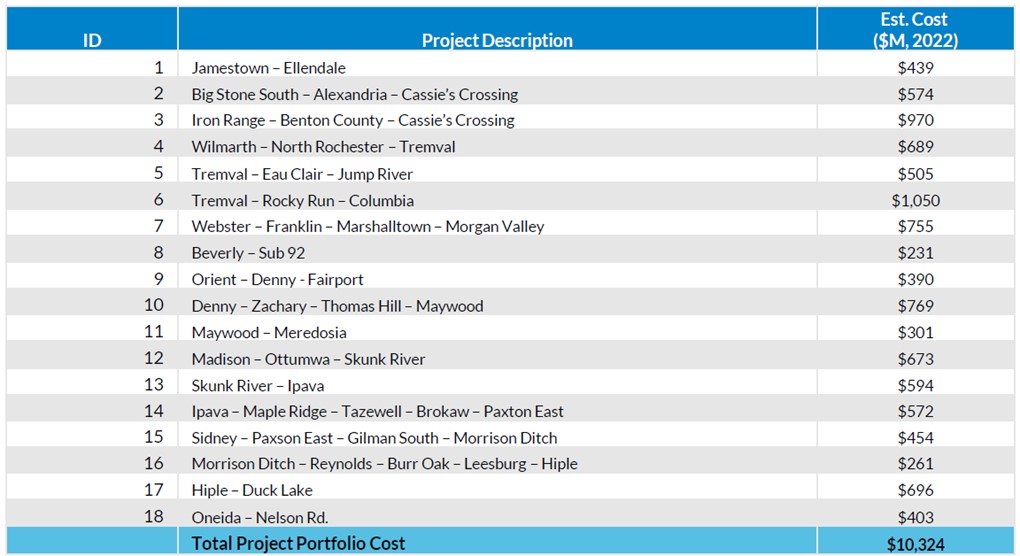 MISO의 LRTP Tranche 1 송전 설비 포트폴리오는 총 18개의 개별 프로젝트들로 구성되어 있는데 그림 4는 이러한 프로젝트들의 위치와 구성을, 표 1은 2022년 7월 25일 당시의 각 프로젝트들의 비용을 보여주고 있다. LRTP Tranche 1 송전 설비 포트폴리오의 총 비용은 103억 달러이다.