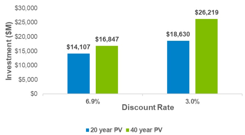 2022년 달러 가치로 환산한 20년과 40년 동안의 수익 요구 조건의 현재 가치를 6.9%와 3.0%의 할인율을 가정하여 예측한 결과가 그림 5에 나타나 있다. 이에 따르면 할인율이 6.9%일 때 총 송전 설비 포트폴리오에 요구되는 수익은 141억 달러에서 168억 달러, 할인율을 3.0%로 가정하면 186억 달러에서 261억 달러의 수준을 갖는다.