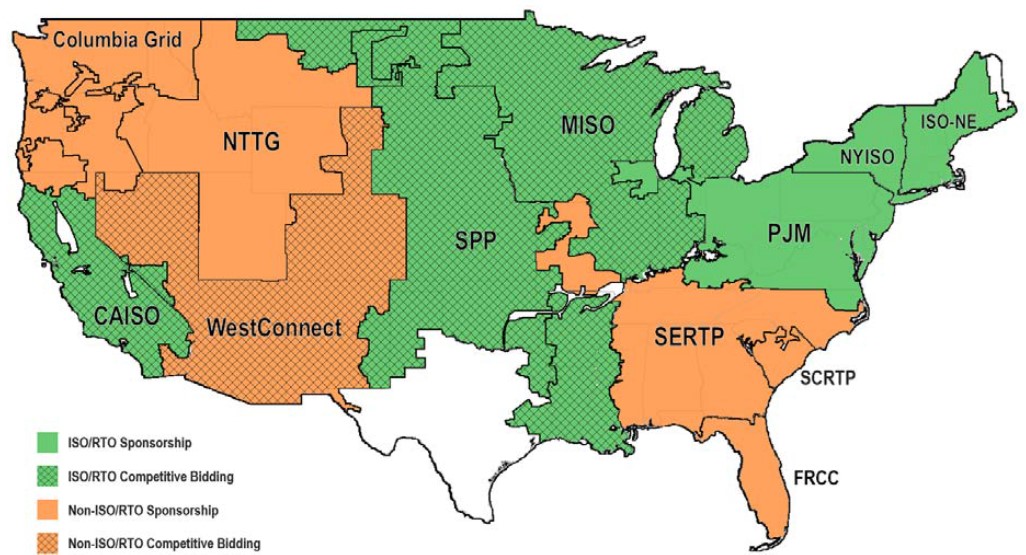미국 주들 간의 상거래에서 전력의 도매 판매 및 송전에 대한 규제를 담당하는 FERC (Federal Energy Regulatory Commission)는 미국 전력 송전에 대한 규제기관 중 최상위 기관 중 하나인데 FERC는 아래의 그림 1과 같이 송전 설비 계획 region들을 지정하고 있다. 본 포스팅에서는 주로 region 송전 설비 계획 및 확충을 논의하도록 한다.
